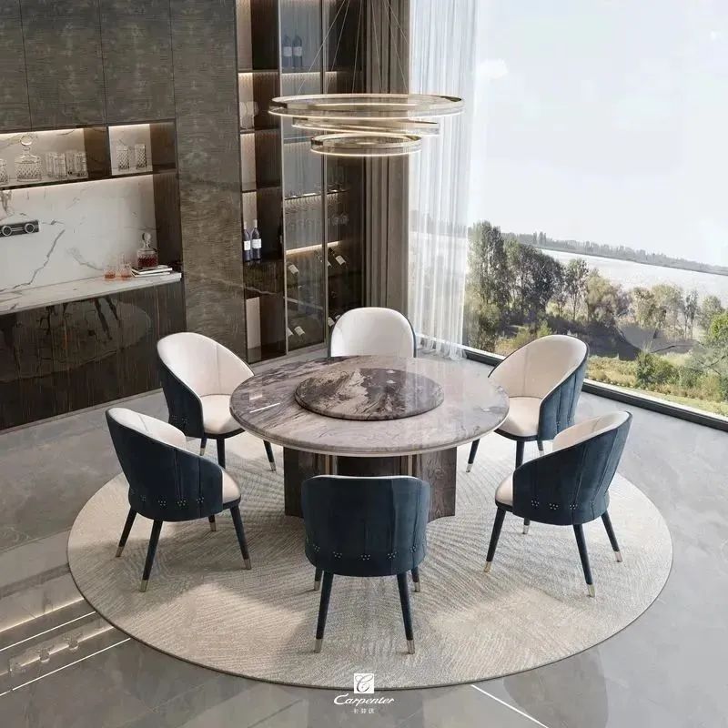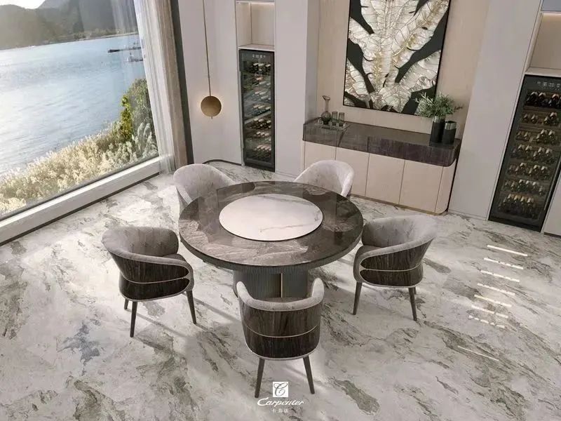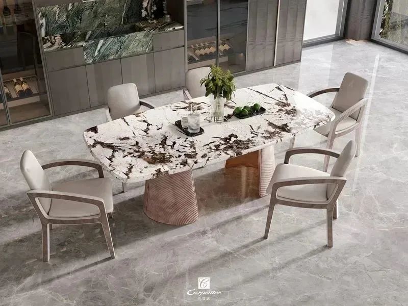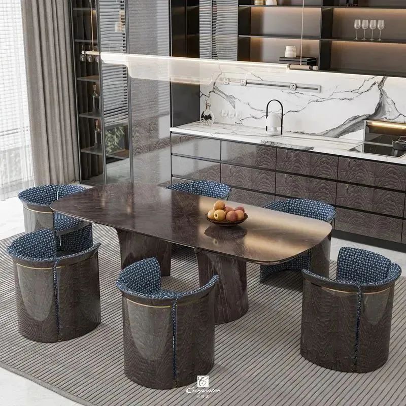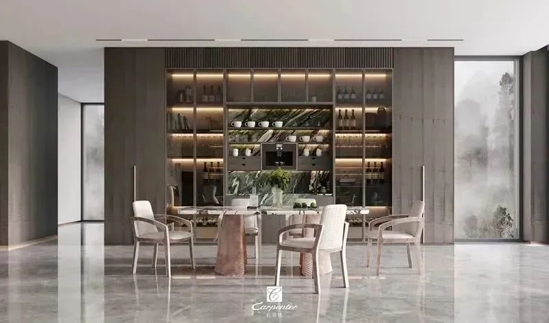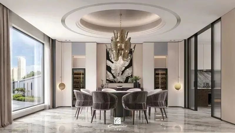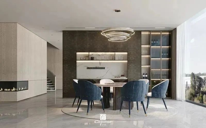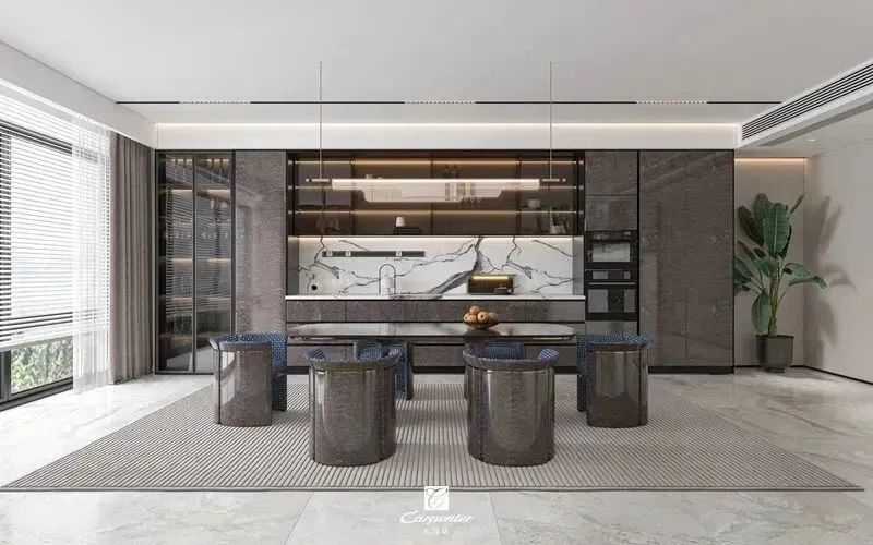 设计师通过材质选择、色彩运用和软装搭配,演绎高级轻奢风。注重空间与功能的结合,餐边柜、酒柜及餐桌椅井然有序、整齐划一,满足用餐、收纳、展示等多重需求。