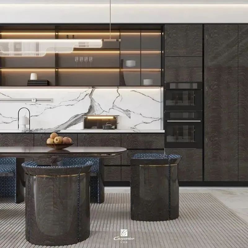 深棕色亮光的定制柜、金边点缀的餐桌椅、间隔使用的玻璃门,细节中透露着浪漫,打造高级精致的轻奢风餐厅,营造情调十足的用餐氛围,用餐也自带精英范儿。